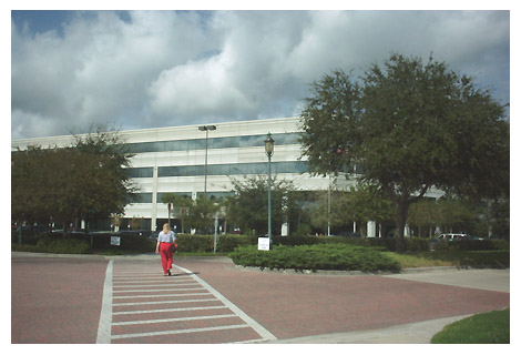 photo caption: A wide shot of my building. And a woman with some ugly ass red pants.